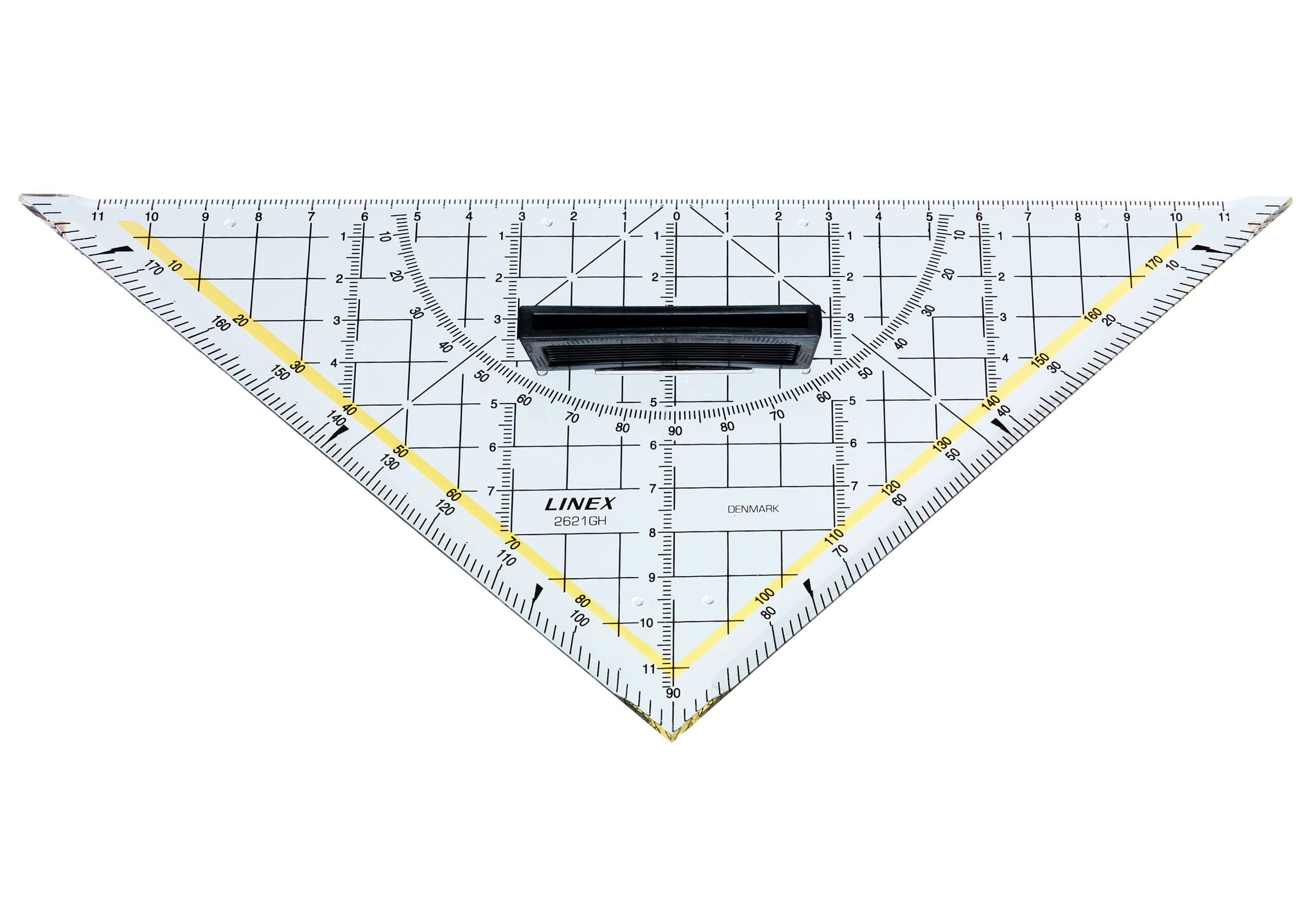 Med facet og lodret kant og vinkelmåler 180 grader, mm-skala og gul stribe samt aftagelig håndtag. 0-punktet midt på hypotenusen. Særlig velegnet ved undervisning i geometri og tegning. Kan anvendes til skravering, gradmåling, oprejsning af den vinkelrette og tegning af geometriske figurer.