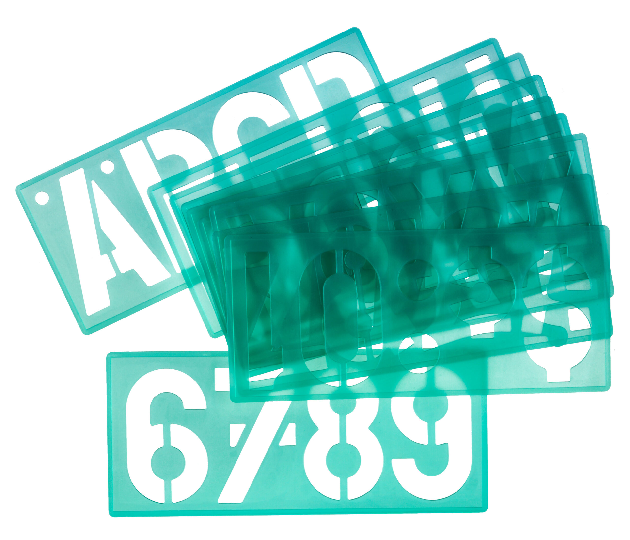 Skabelon med store bogstaver, tal og symboler. Til brug hjemme, i skolen og på arbejdet. En let og hurtig måde at skrive bogstaver til arkivering, skilte og mange andre formål. Tuschknopperne forhindrer, at farven gnides ud. 100 mm skrifthøjde.