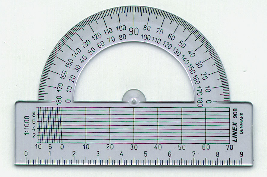 Halvcirkulær skolevinkelmåler. Transversalskala og lineal. Buelængde 180°, gradinddeling 1/1°, diameter 80 mm.