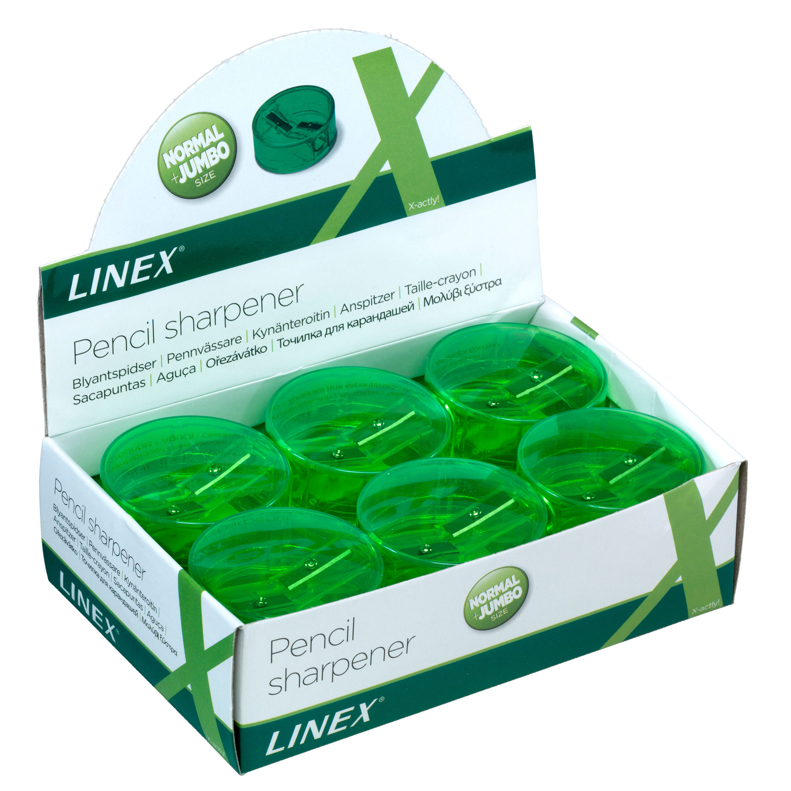 Transparent plast blyantspidser med container med 2 huller til alm blyanter og jumbo blyanter, trekantede, runde eller sekskantede. Hullerne i spidseren kan lukkes for at undgå at affaldet ryger ud.