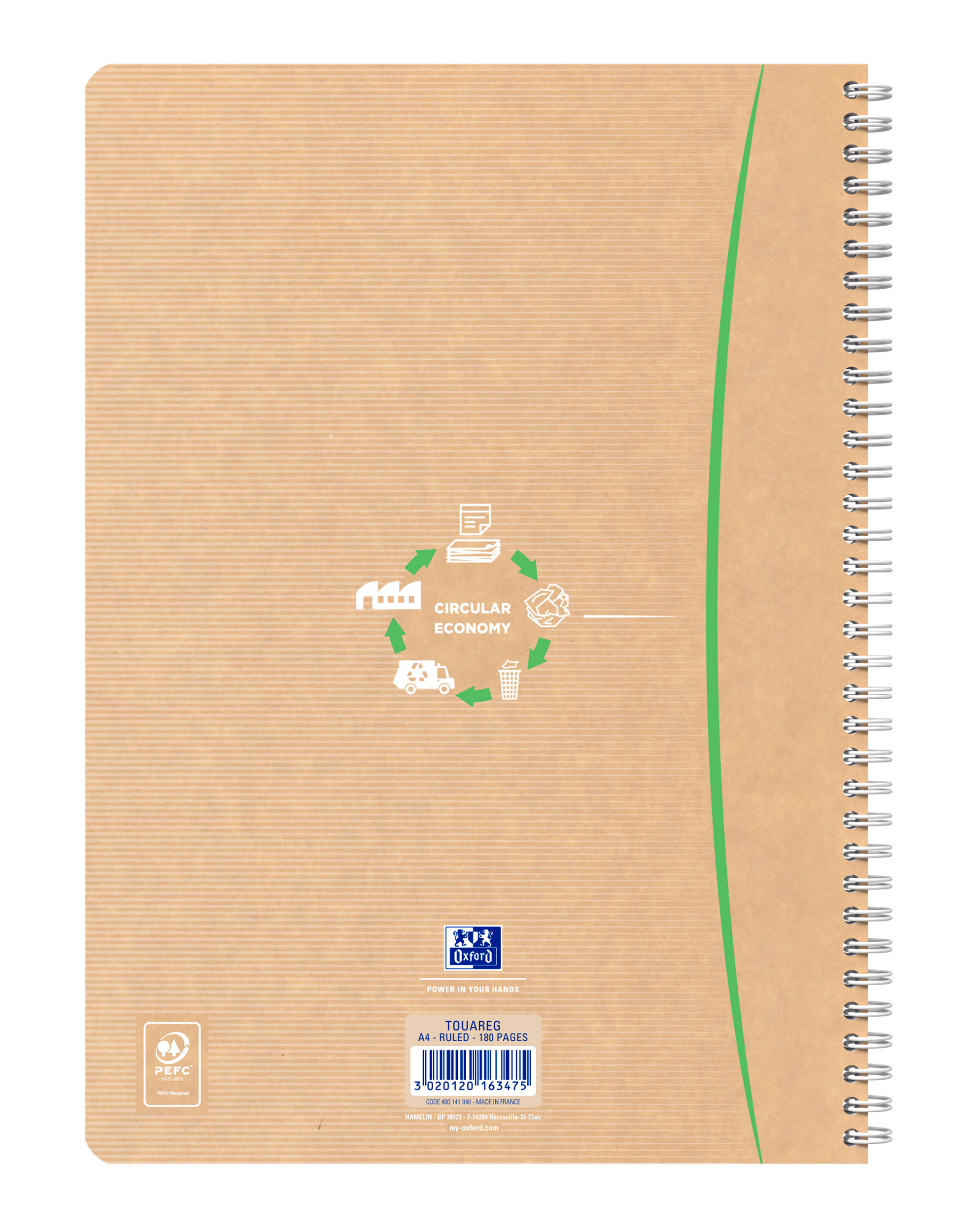 Hvis du er på udkig efter en notesbog med genbrugspapir, der holder længe, er flot og frem for alt ikke går på kompromis med kvaliteten, skal du ikke lede længere. Papiret i OXFORD Touareg er lavet af 100% genanvendte fibre. Det er blødt og glat, så du føler glæde og velvære, hver gang du skriver. Notesbogens bemærkelsesværdigt enkle omslag kombinerer robust kraftkarton med naturlige farver, hvilket giver både elegance og modstandsdygtighed. Serien af Touareg-notesbøger omfatter notesbøger med dobbelt spiral i størrelserne A5 og A4 med et minimalistisk og elegant design, der fås i 5 naturlige farver. Der tilbydes desuden et udvalg af matchende Oxford-arkiveringsprodukter.