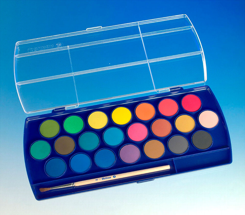 farverne, så der skabes sekundærfarver fra farvespektret, hvilket er unikt for Pelikan vandfarvesæt. Disse dækkende og strålende vandfarver har høj opasitet og kan bruges på både papir og pap.
