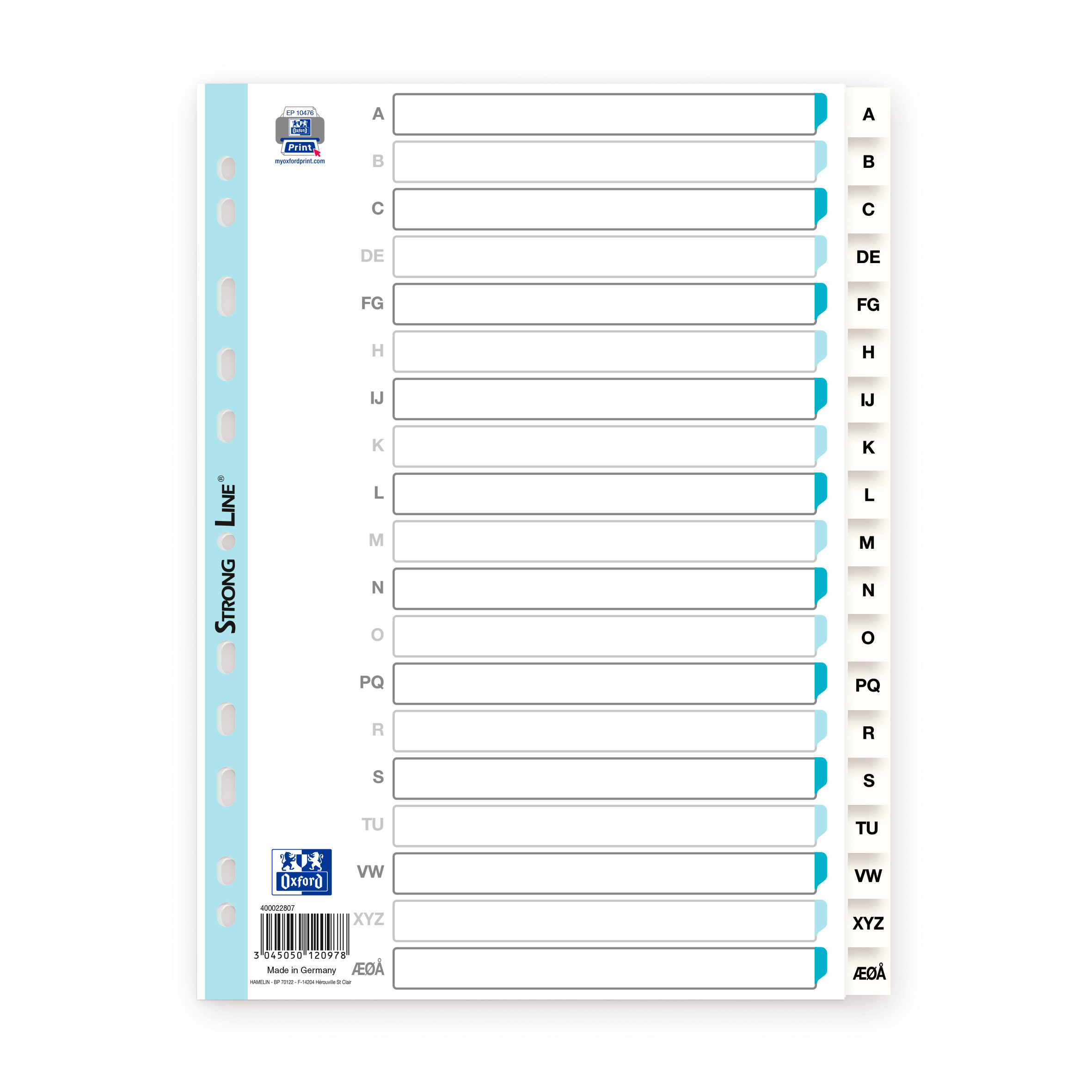 Register fremstillet i slidstærk PP-folie. Alfabet fordelt på 19 skilleblade. Forsynet med trykt kartonforblad med Strong-Line® hulforstærkning. Personliggør forbladet på www.oxfordprint.com