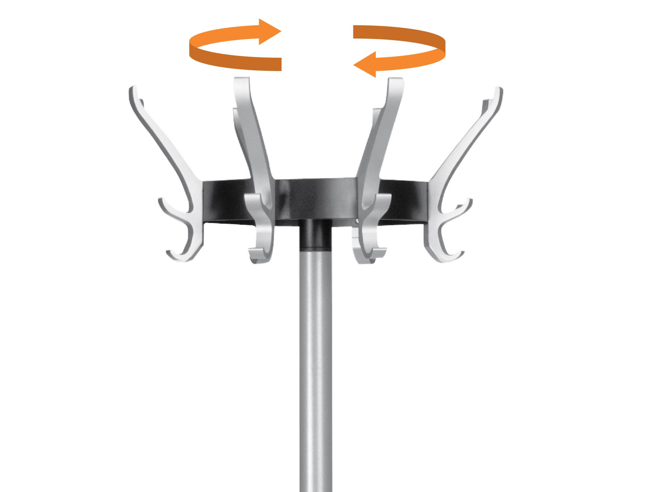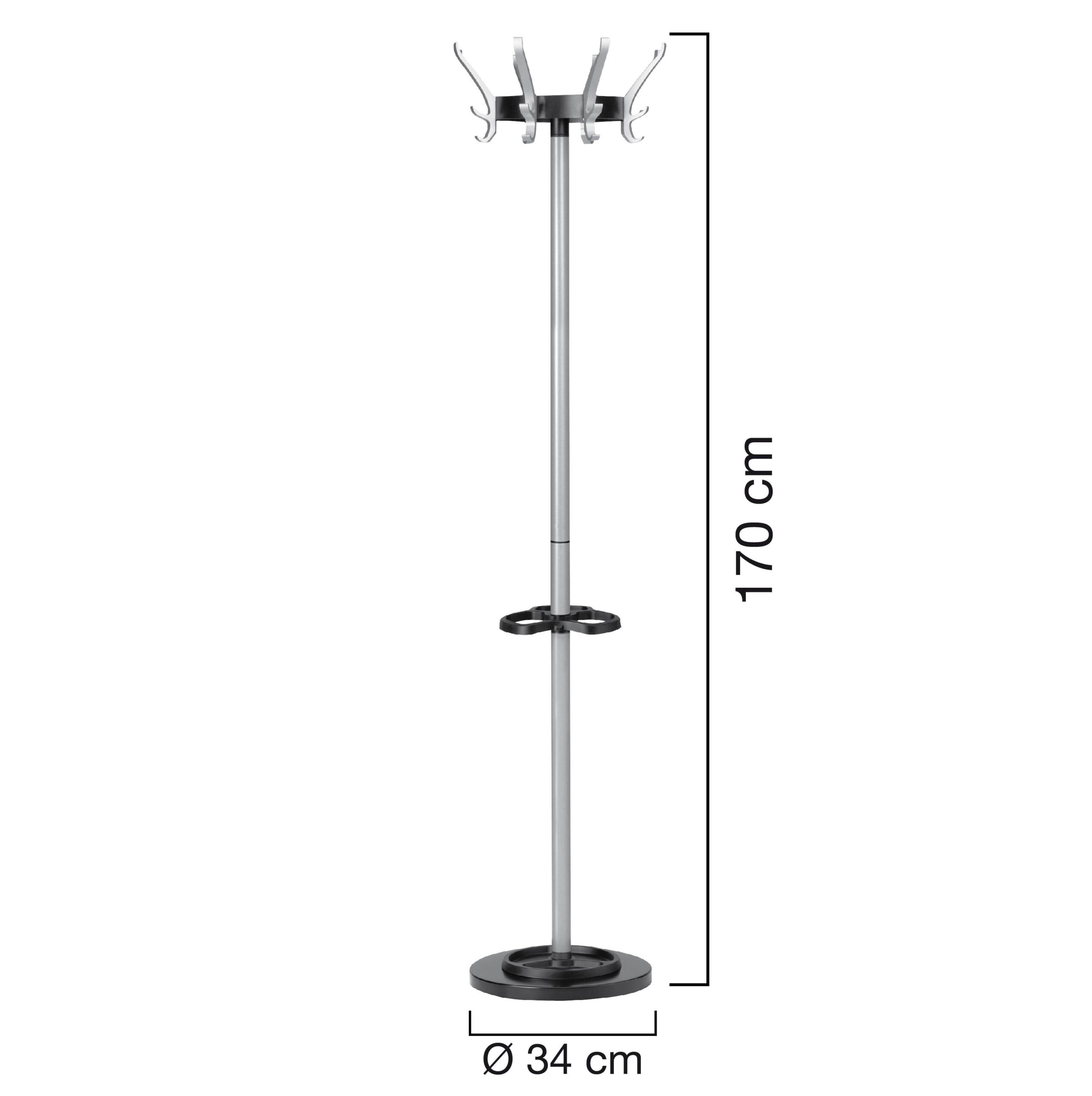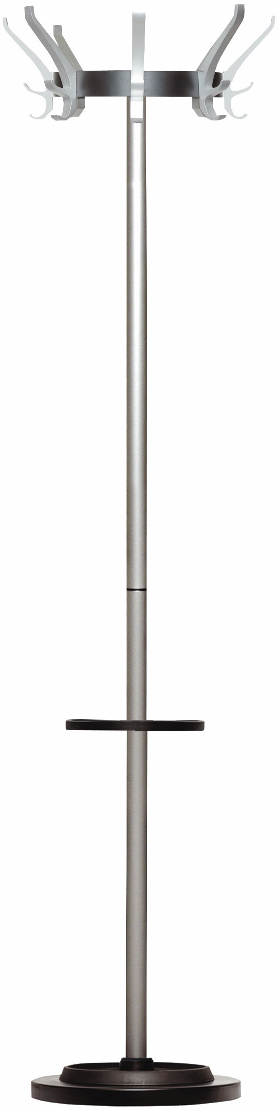 Cypres stumtjener med 8 knager. Designet i aluminium med 3 muligheder for ophæng på hver knage, roterende hoved. Udstyret med højde justerbar paraply stander.