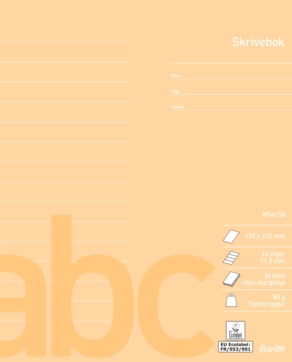Bantex skolehefter Norsk Standard NS4150 har alle en høy produktkvalitet. Det finnes et stort antall linjeringer å velge mellom, slik at elever i alle aldre med fordel kan bruke skoleheftene. Hver linjeringstype har forskjellig farge, slik at det er enkelt å gjenkjenne den linjeringstypen som elevene pleier å bruke. Der er nyttige opplysninger samt linjal på baksiden av heftet. EU-ecolabel.