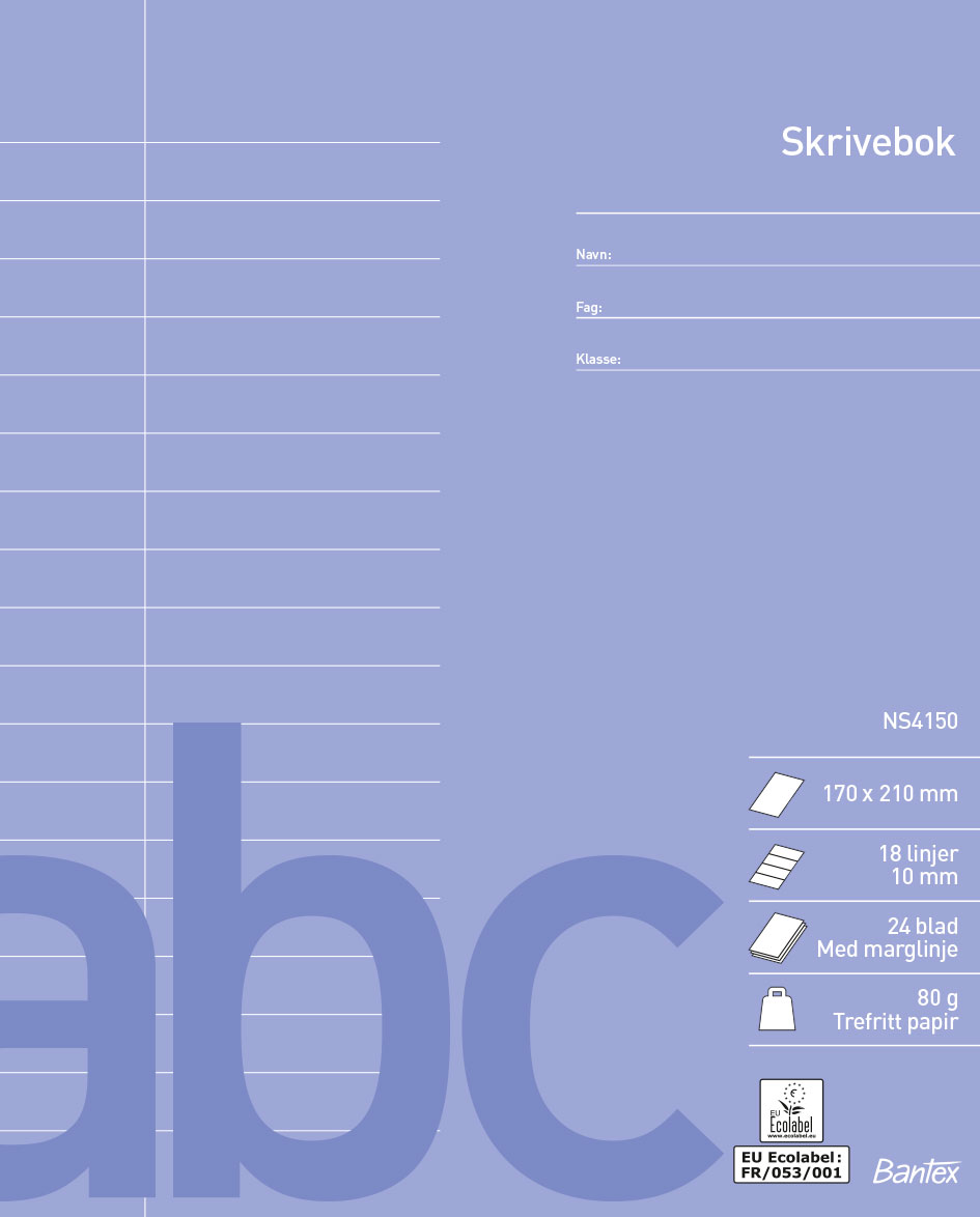 Bantex skolehefter Norsk Standard NS4150 har alle en høy produktkvalitet. Det finnes et stort antall linjeringer å velge mellom, slik at elever i alle aldre med fordel kan bruke skoleheftene. Hver linjeringstype har forskjellig farge, slik at det er enkelt å gjenkjenne den linjeringstypen som elevene pleier å bruke. Der er nyttige opplysninger samt linjal på baksiden av heftet. EU-ecolabel.