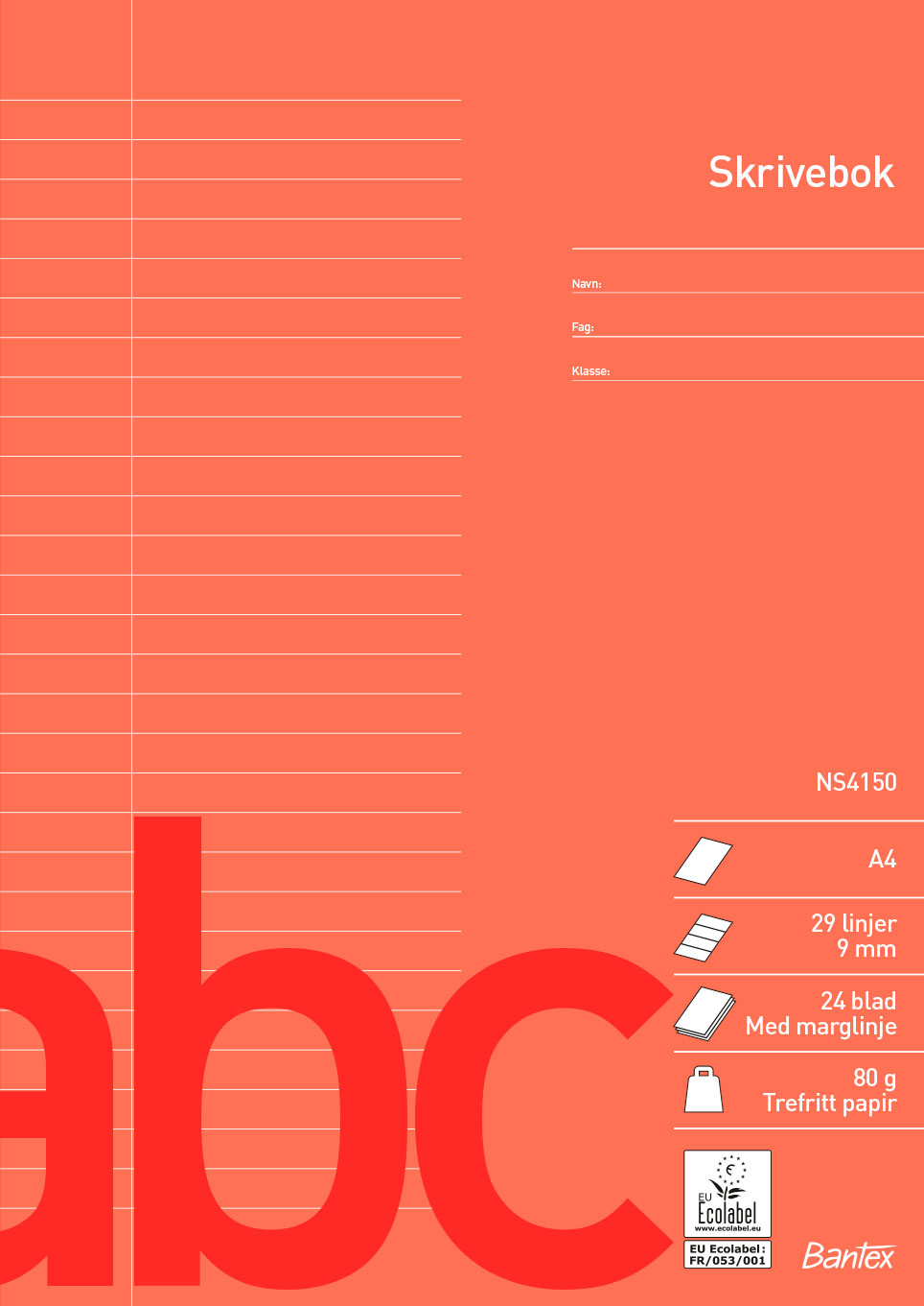 Bantex skolehefter Norsk Standard NS4150 har alle en høy produktkvalitet. Det finnes et stort antall linjeringer å velge mellom, slik at elever i alle aldre med fordel kan bruke skoleheftene. Hver linjeringstype har forskjellig farge, slik at det er enkelt å gjenkjenne den linjeringstypen som elevene pleier å bruke. Der er nyttige opplysninger samt linjal på baksiden av heftet. EU-ecolabel.
