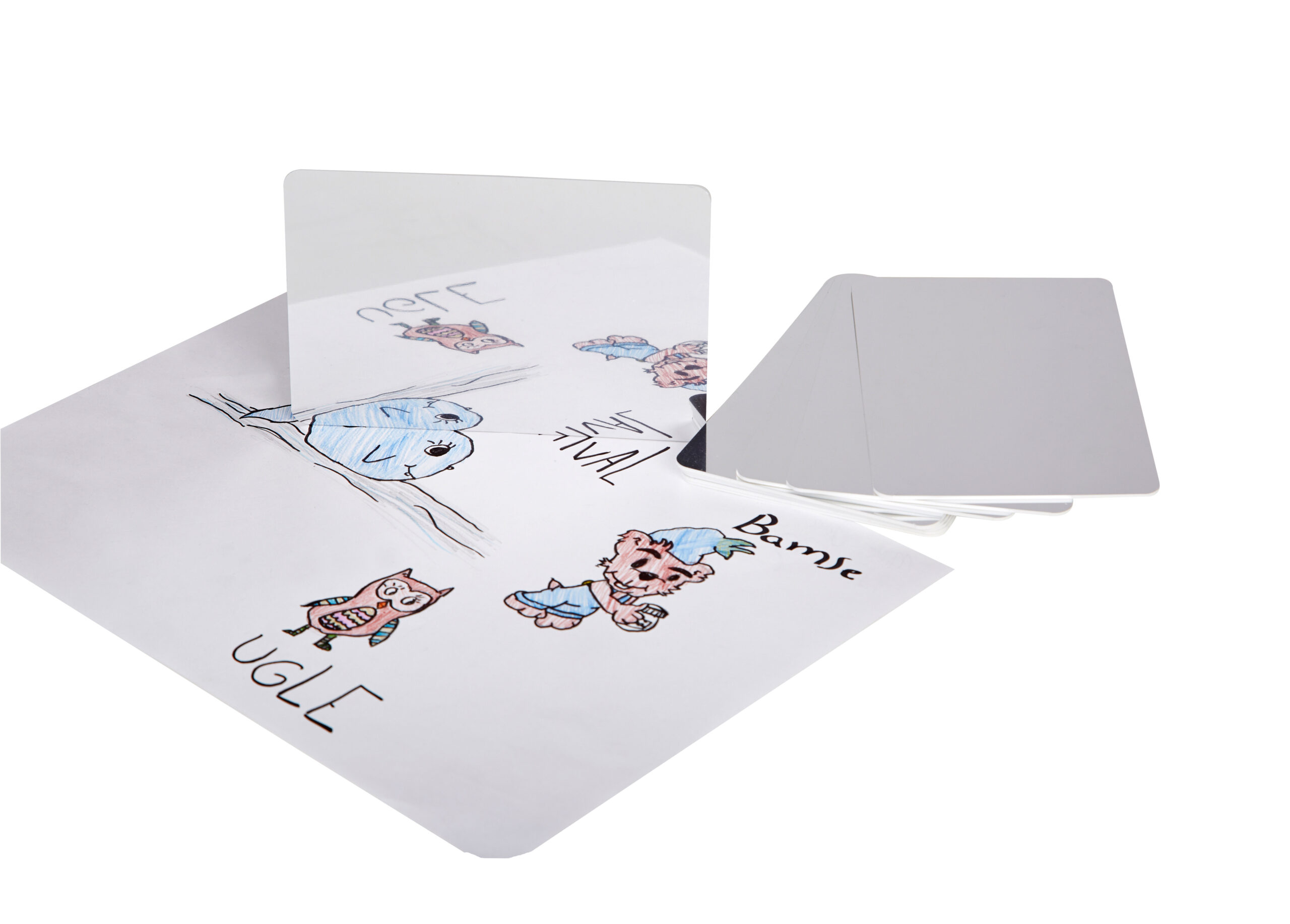Sett med 10 plastspeil med reflekterende side. For optiske og reflekterende øvelser. Mål: 15×10 cm. Runde hjørner. Brukes til institusjoner, førskole og mellomtrinn.