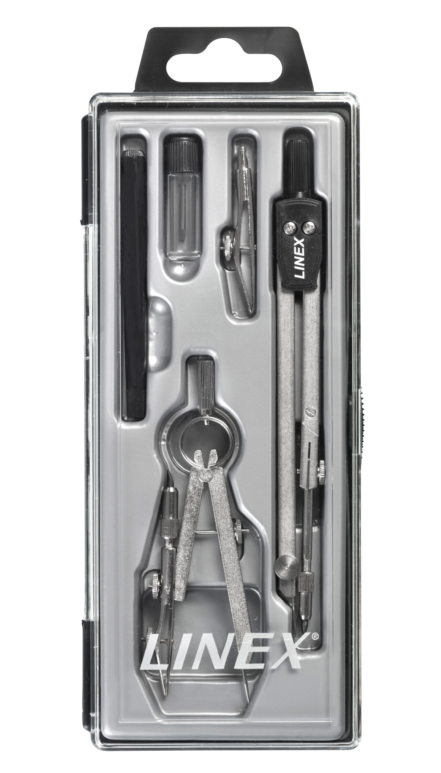 Inneholder blypasser med bøy på det ene benet, jomfrupasser, tegnepenn med skaft og ekstra bly.