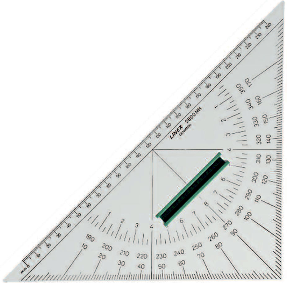 Med loddrett kant og håndtak. Inndelt i mm, i grader og streker. Til å sette kurs og distanse.