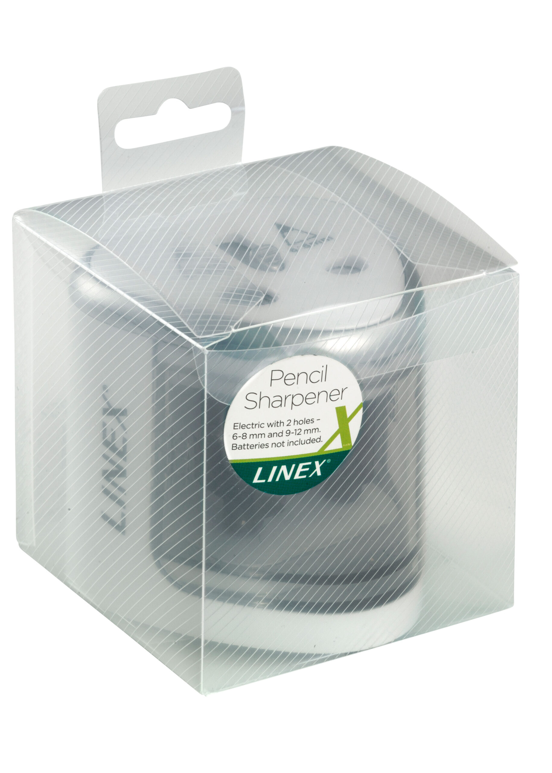 Batteridrevet blyantspisser til standardblyanter (diameter 6–8 mm) og jumboblyanter (diameter 9–12 mm). Gjennomsiktig beholder som gjør det enkelt å se når den må tømmes. Bruker fire 1,5 V AA-batterier, medfølger ikke.
