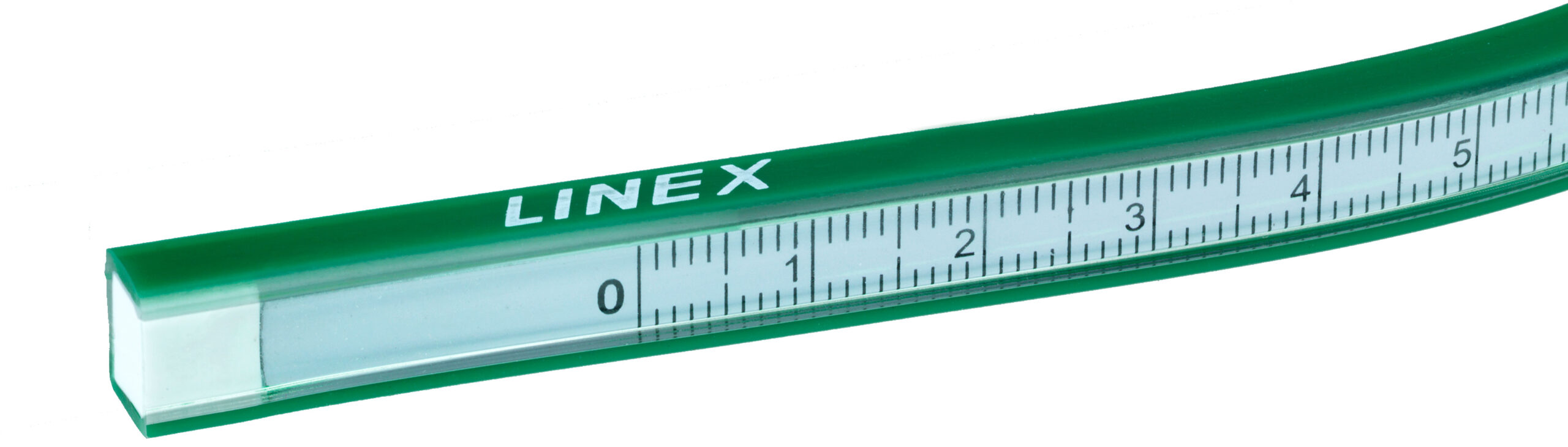 Bøyelig kurvelinjal av vinyl med tusjkant. Med innlegg av stål og bly, som gjør at det innstilte kurveforløpet holder. Kan brukes til tegning av kurveforløp ned til radius på 15 mm. Utstyrt med målinndeling.