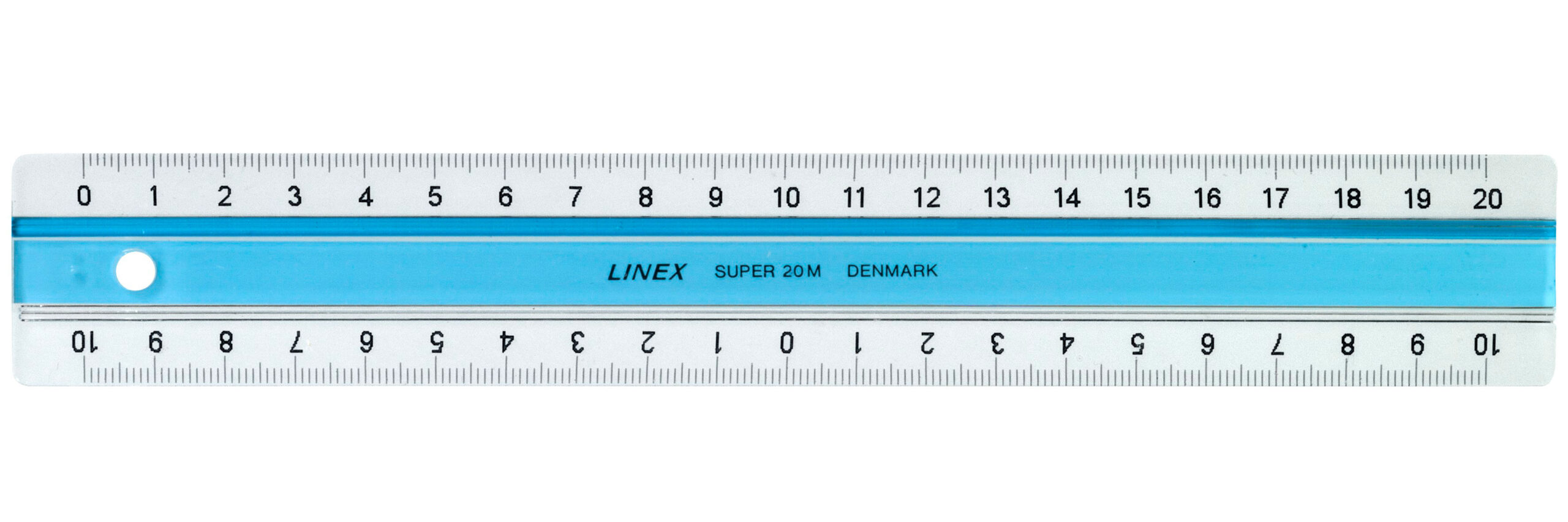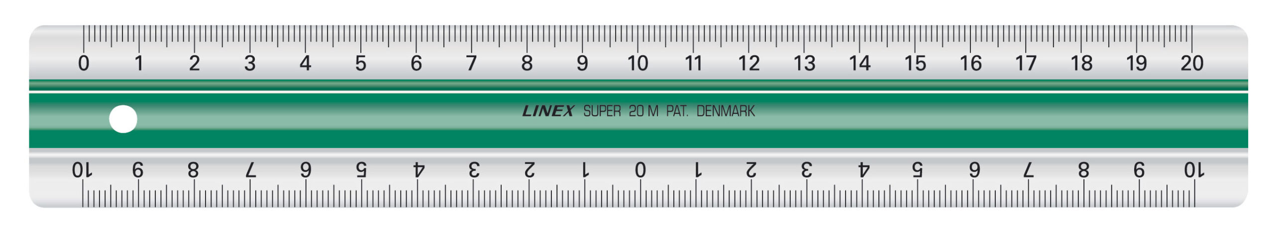 Inndelt i mm med en 0–20 cm skala på den ene siden og en 10–0–10 cm skala på den andre siden.