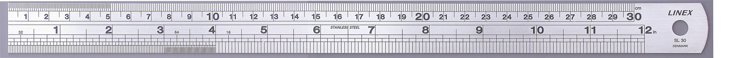 Rustfri stållinjal med mål i cm og tommer. Med mange inndelinger på begge skalaer samt omregningstabeller på baksiden.