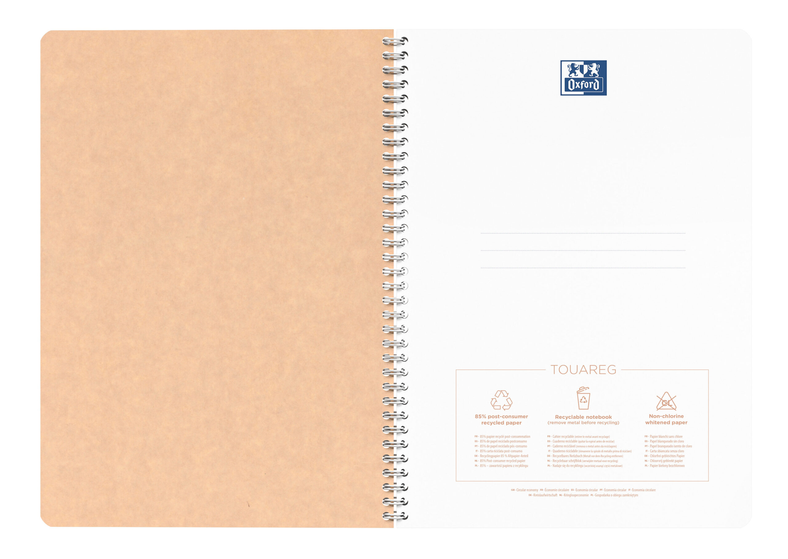 Hvis du leter etter en notatbok med resirkulert papir som har lang levetid, ser bra ut og fremfor alt, ikke går på akkord med kvaliteten, trenger du ikke lete lenger. Papiret i OXFORD Touareg er laget av 100 % resirkulerte fibre; det gir papiret en mykhet og glatthet som gir deg en følelse av glede og komfort hver gang du skriver. Det bemerkelsesverdig enkle omslaget kombinerer et robust kraftmateriale med naturlige farger, og resultatet er en slank og elegant stil som ikke går på akkord med kvaliteten. Serien med Touareg notatbøker består av notatbøker med dobbelspiral i formatene A5 og A4 med minimalistisk og elegant design i 5 naturlige farger. Det finnes også et matchende utvalg av Oxford arkiveringsprodukter.