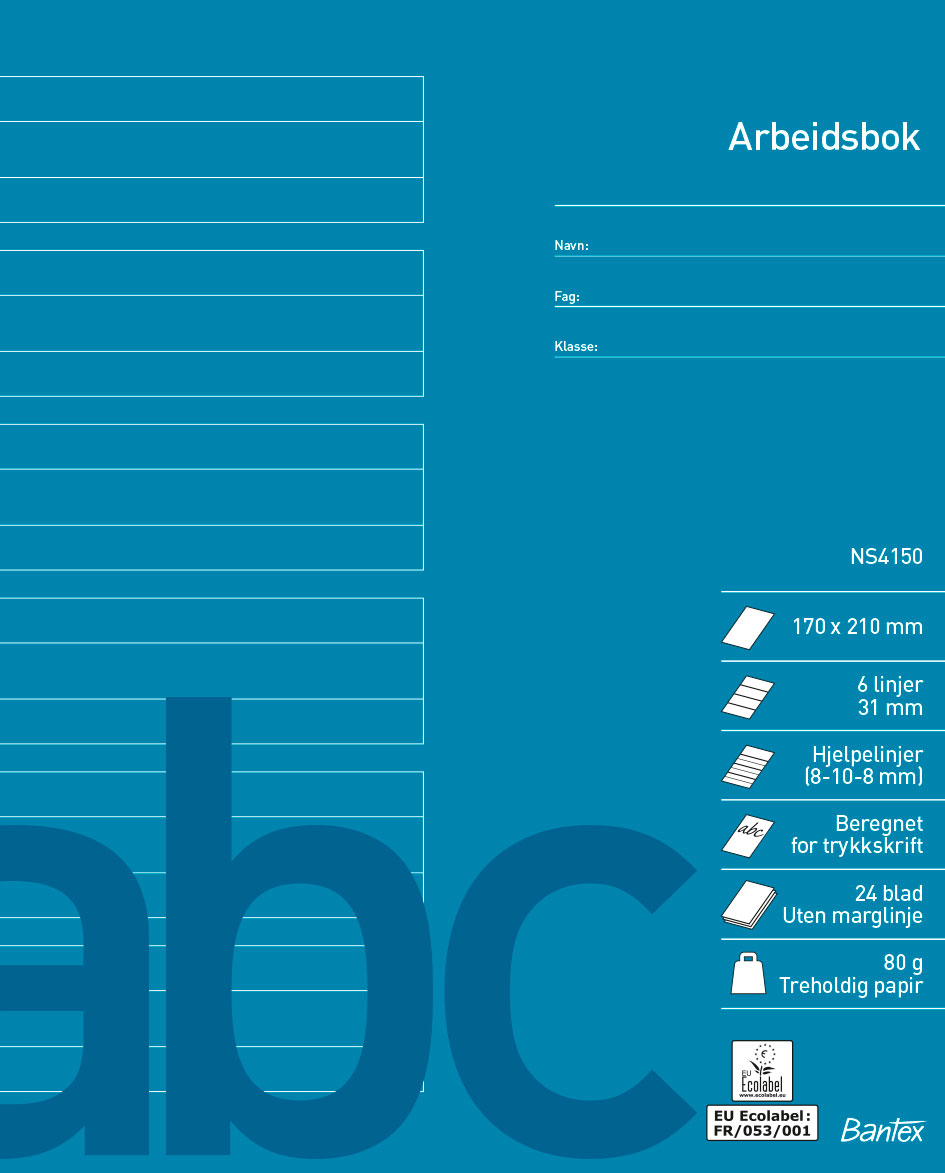Alla Bantex skolhäften Norsk standard NS4150 håller hög produktkvalitet. Det finns ett stort antal linjeringsalternativ att välja mellan, vilket innebär att elever i alla åldrar med fördel kan använda skolhäftena. Varje linjeringstyp har en egen färg, vilket gör det lätt för eleverna att känna igen den linjeringstyp de brukar använda. På baksidan av häftet finns praktisk information samt linjal. EU-ecolabel.