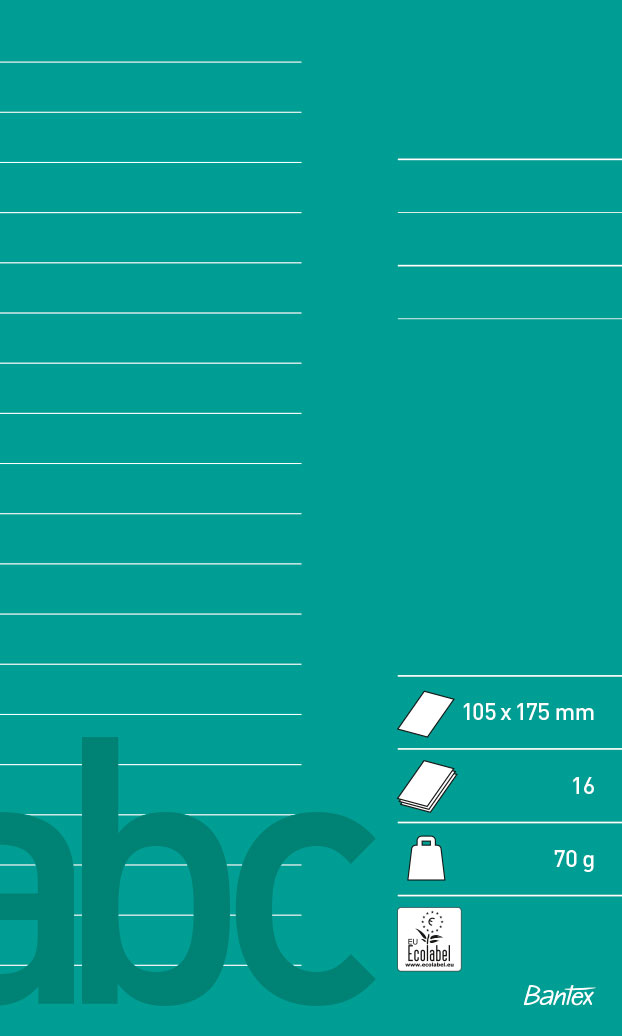 Alla Bantex skolhäften håller hög produktkvalitet. Det finns ett stort antal linjeringsalternativ att välja mellan, vilket innebär att elever i alla åldrar med fördel kan använda skolhäftena. Varje linjeringstyp har en egen färg, vilket gör det lätt för eleverna att känna igen den linjeringstyp de brukar använda. På baksidan av häftet finns praktisk information samt linjal. EU-ecolabel.