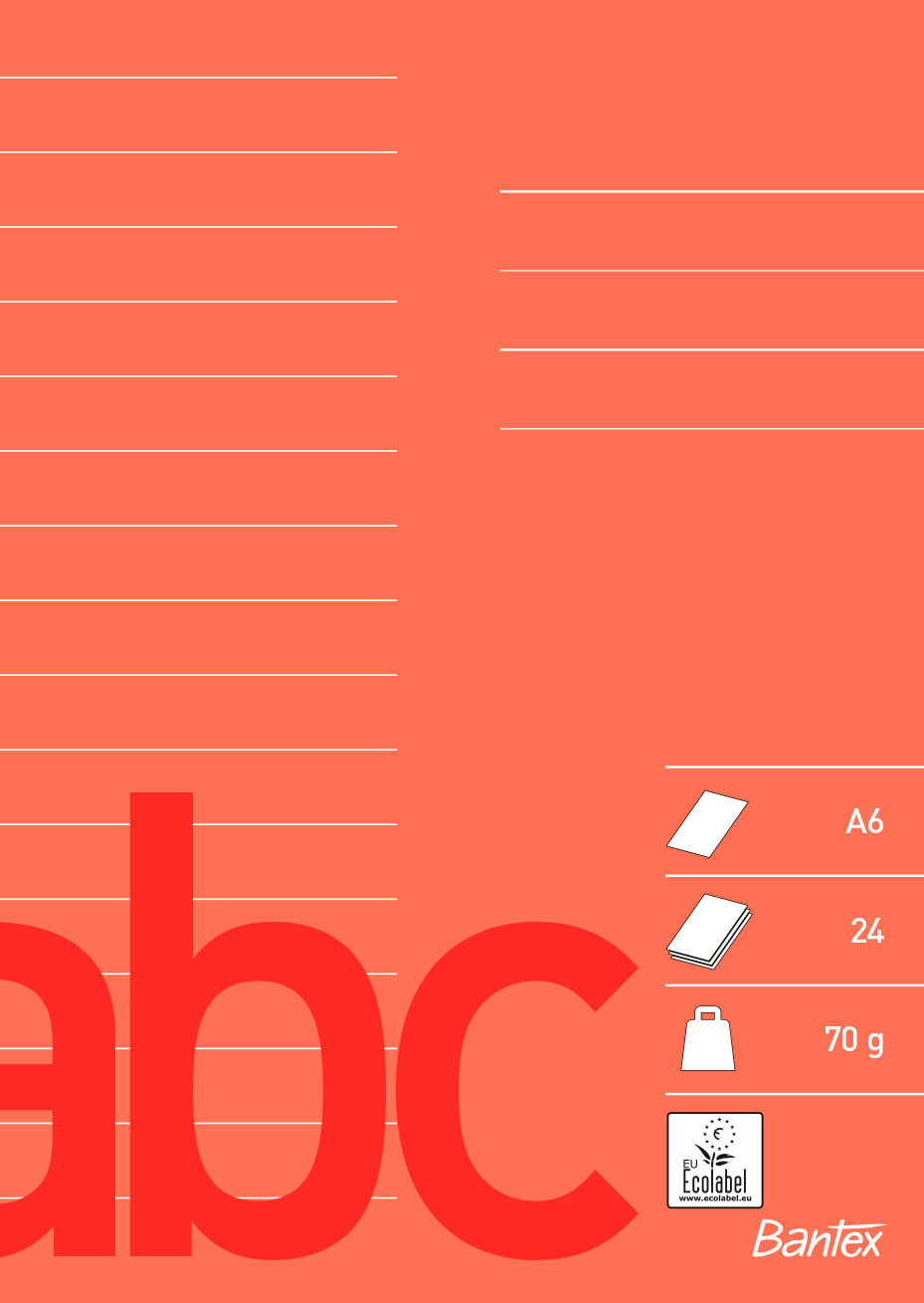 Alla Bantex skolhäften håller hög produktkvalitet. Det finns ett stort antal linjeringsalternativ att välja mellan, vilket innebär att elever i alla åldrar med fördel kan använda skolhäftena. Varje linjeringstyp har en egen färg, vilket gör det lätt för eleverna att känna igen den linjeringstyp de brukar använda. På baksidan av häftet finns praktisk information samt linjal. EU-ecolabel.