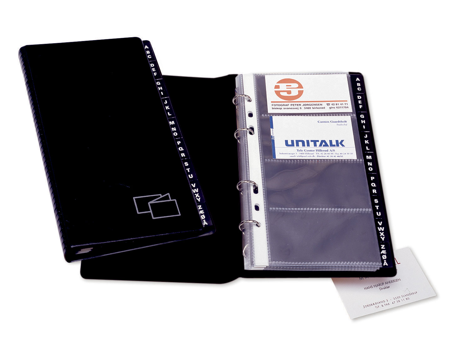 Visitkortspärm med lösa visitkortsfickor och 9-delat alfabetsregister. Innehåller 10 visitkortsfickor med plats för totalt 80 visitkort i maxstorlek 100 x 55 mm. Albumets framsida är smalare än indexet och täcker inte flikarna när pärmen är stängd. Ringpärmen är tillverkad av återvunnen kartong täckt med slitstark plast.