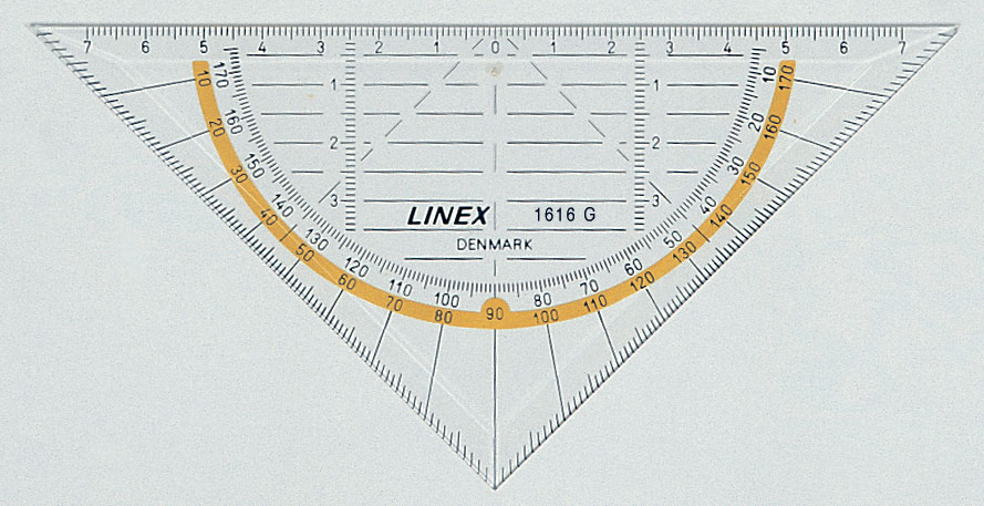 Avfasad. Vinkelmätare 180 grader, mm-skala och gul rand. 0-punkt mitt på hypotenusan. Särskilt lämplig för undervisning i geometri och teckning. Kan användas för skuggning, gradmätning och när man vill göra räta vinklar och teckna geometriska former. Material: glasklar polystyren.
