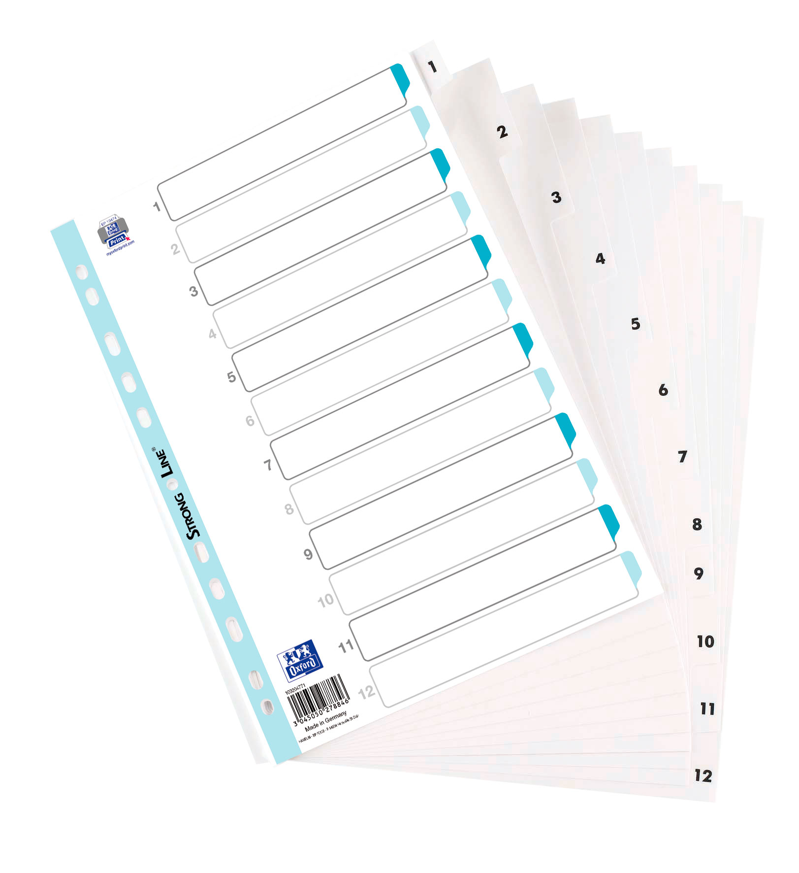 ELBA A4 15/100 frostade vita polypropylenavdelare som har en perforerad remsa och 12 färgade, numrerade flikar med Strongline®-förstärkning. Förstärkt och tryckbart försättsblad