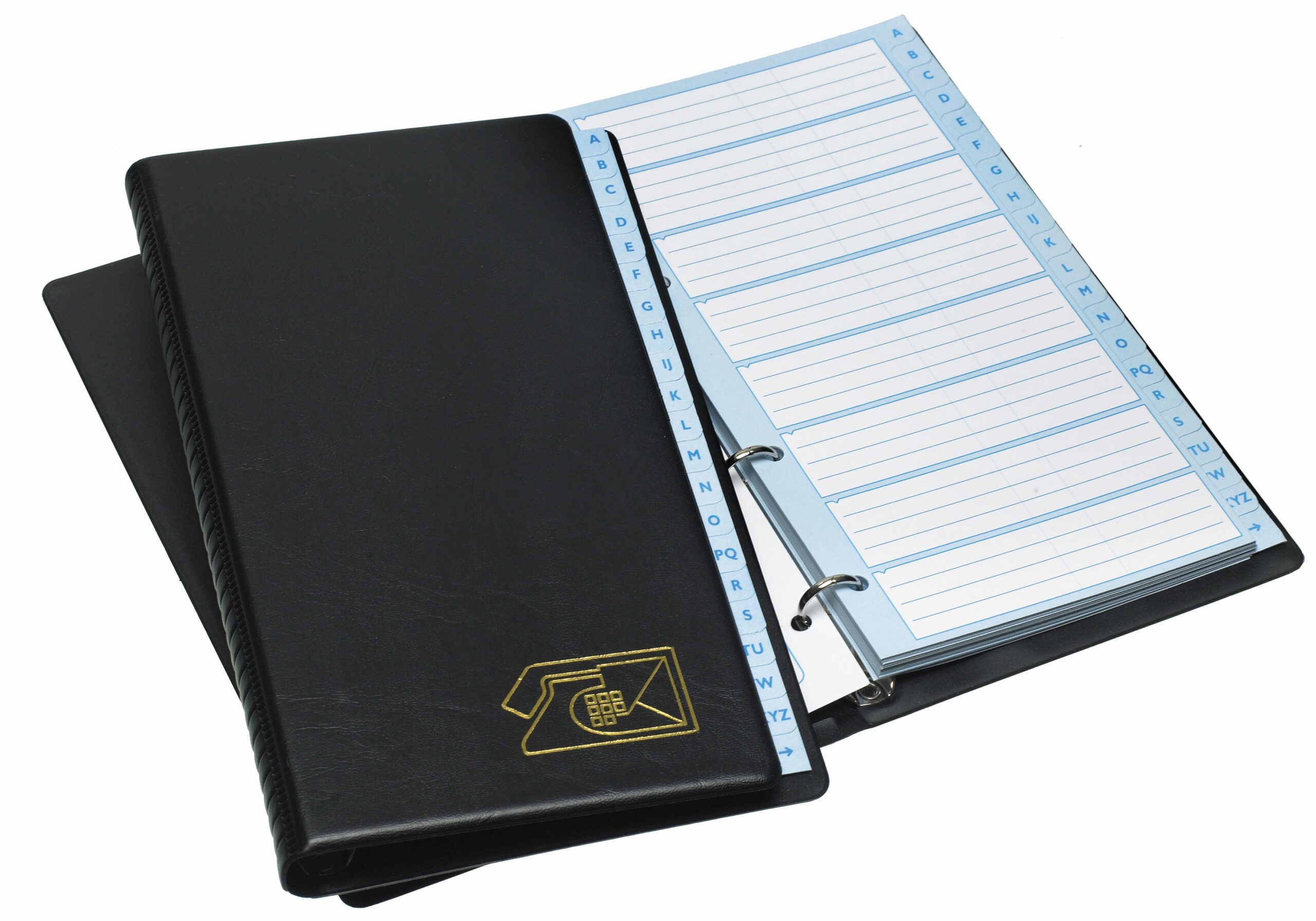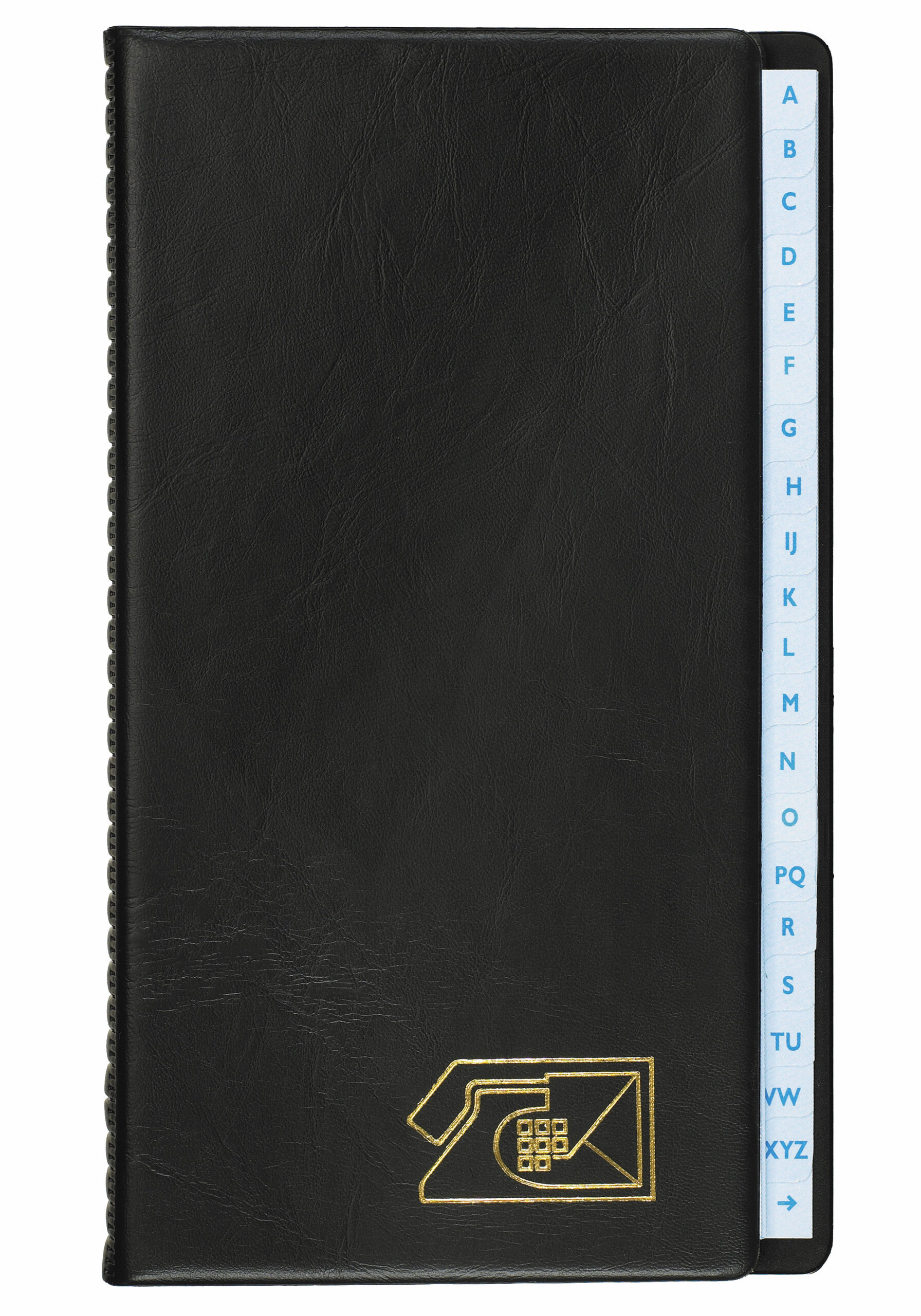 Comes with telephone index, spare sheets and self-adhesive correction labels. The front cover of the index is designed to reveal the tabs of the index, making it visible even when the file is closed. The alphabetical index has 24 divisions and is mounted in a 13 mm 45-65-45 mechanism. 12-pc. pack in sales display. Black or assorted blue and black