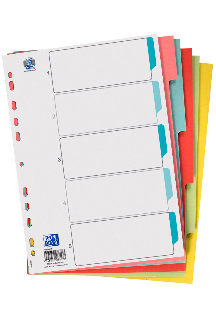 Oxford A4 neutral dividers are made from 160g card and feature 5 positions, plus a reinforced and printable flyleaf. Matching colours: Red, Blue, Yellow, Green, pink