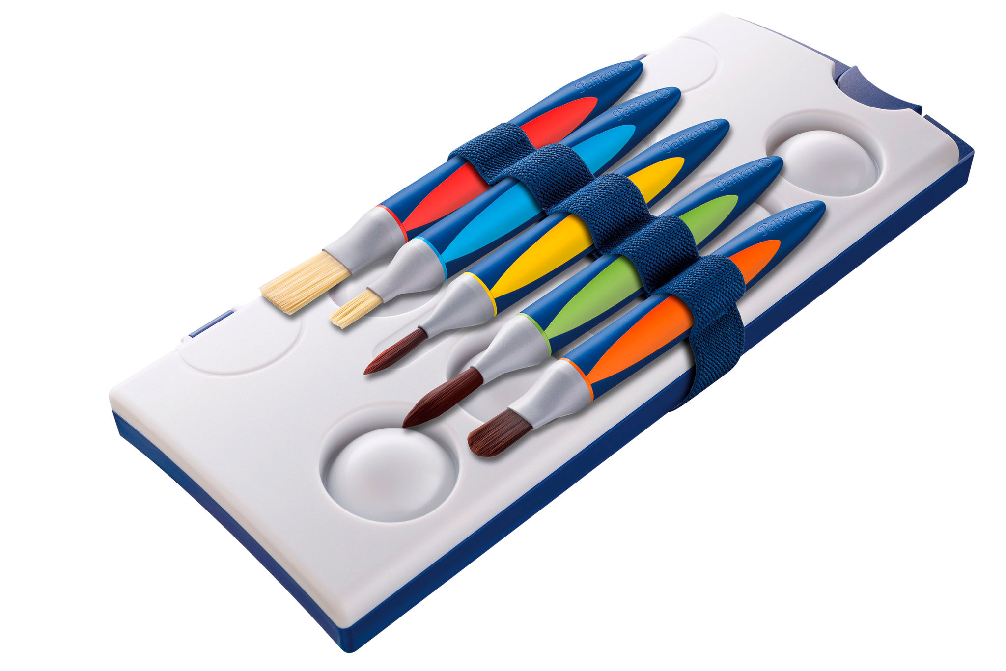 Thanks to their special ergonomic and non-slip triangular handles, Pelikan griffix brushes are exceptionally comfortable to hold thanks to their child-friendly length. The shape also prevents the brushes from rolling away. All Pelikan griffix brushes with premium-quality synthetic bristles are dimensionally stable and do not shed. Furthermore, the griffix brushes are very easy to clean and dry quickly – so they’re ready to create new, colorful worlds in no time. The griffix brush set consists of two brushes with flat heads, like classic bristle brushes (sizes 12 and 6), two brushes with round heads, like traditional hair brushes (sizes 10 and 6), and one synthetic brush (size 10). The flat griffix brush in size 12 is ideal for large areas. The size 6 brush makes it easy for children to paint smaller areas, edges, and rough lines. The Griffix hair-like brush with a rounded tip in size 10 is perfect for curved lines and larger details, while the size 6 brush is ideal for fine details. Finally, the Pelikan Griffix synthetic brush in size 10 – a so-called cat’s tongue brush – is the all-rounder and excellent for strokes, curves, and flowing lines. All Griffix brushes are held together by the brush band included in the set and can thus be attached directly to the paint box. Pelikan quality – Made in Germany
